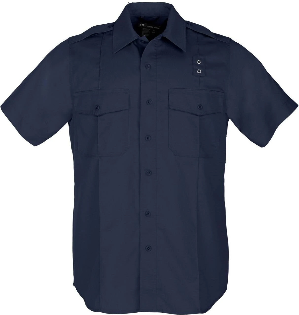 The 5.11 Tactical Taclite PDU Class A Short Sleeve Shirt is crafted with a 5.8 oz. cotton/poly twill fabric, a perfect blend of rugged durability, reliable performance, and breathable comfort. The Teflon coating repels moisture, stains, and soil. Permanent creases offer a professional look and the bi-swing shoulders provide full mobility. Underarm vents keep you cool and dry. This uniform shirt also has a pass-through mic cord to keep you connected. Lastly, this shirt comes with epaulettes, badge tabs, and a front zippered placket. Also available in Long Sleeve!